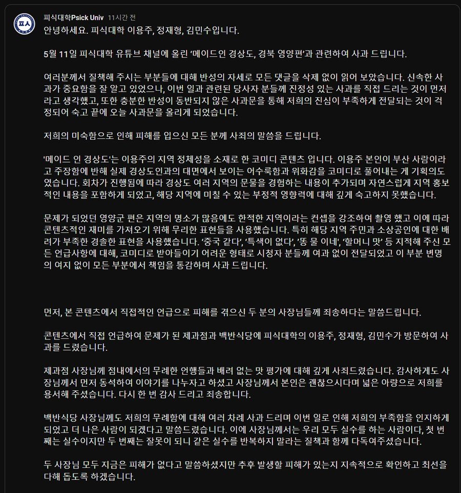 피식대학 영양편 사과문 + 댓글 반응