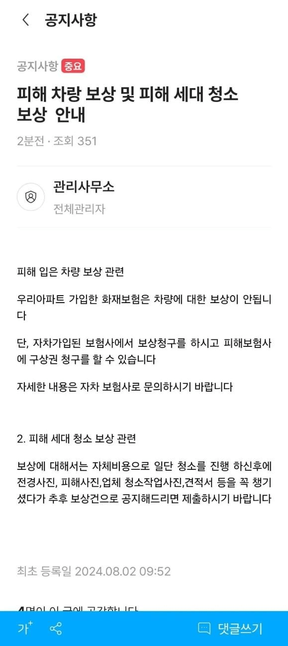 관리사무소 공지 뜸. 화재 보험에 차량 배상 항목 없다고 함