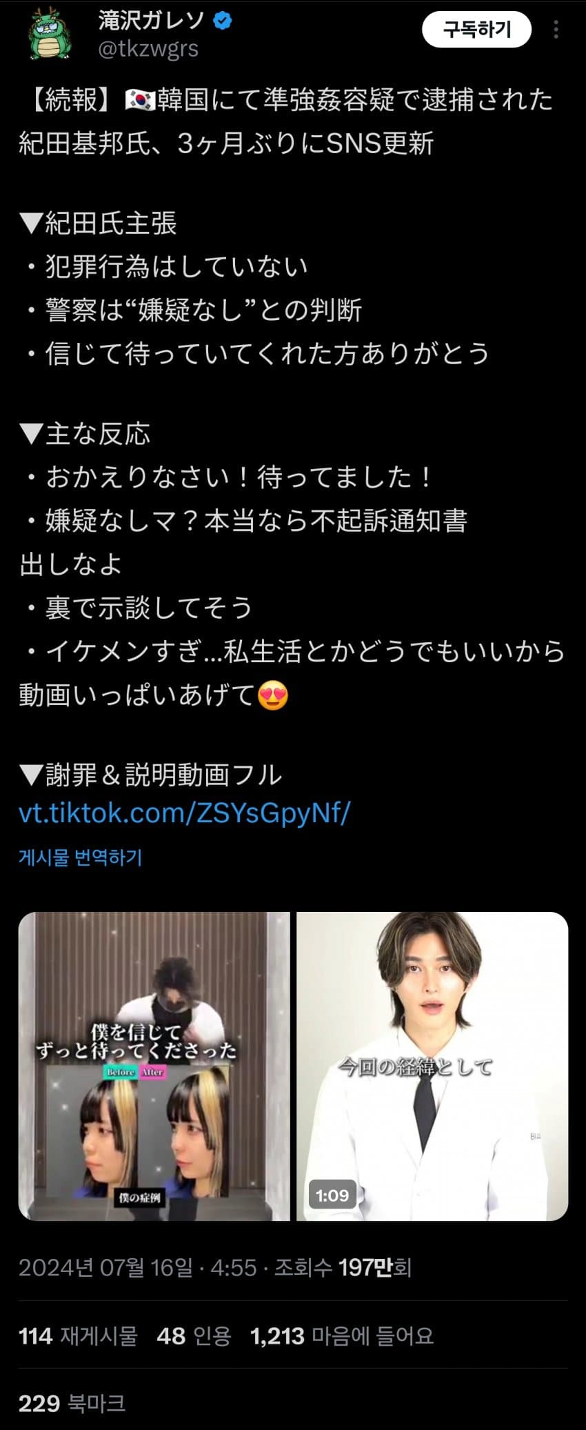 한국에서 준강간 혐의로 체포된 기타 모토쿠니씨, 3개월만에 SNS 갱신