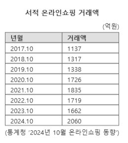 2일 통계청에 따르면 올해 10월 ‘서적’ 온라인쇼핑 거래액은 2060억원으로 전년동월 대비 399억원(24.0%)이 늘었다. 2017년 1월부터 온라인쇼핑 통계 개편 이래 10월 기준 역대 최대 거래액이다. 전년동월 대비 증감률 역시 2021년 1월(55.4%) 이후 최대치다. 전년동월 대비 증감률은 팬데믹이던 2020년부터 2021년 초까지 20~50%대를 오갔다.