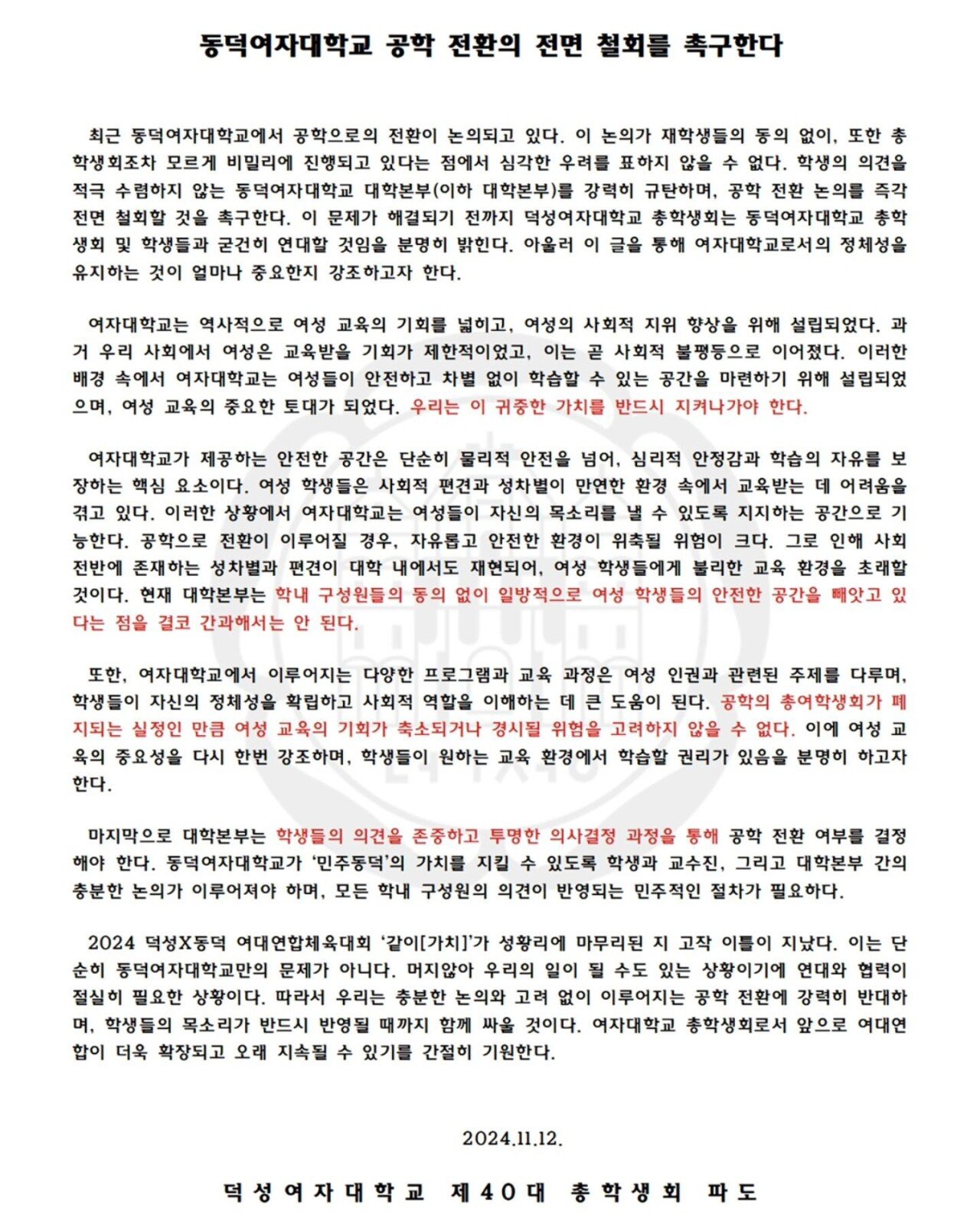 속보) 동덕,성신,힌양전문에 이어 덕성여대도 시위 동참