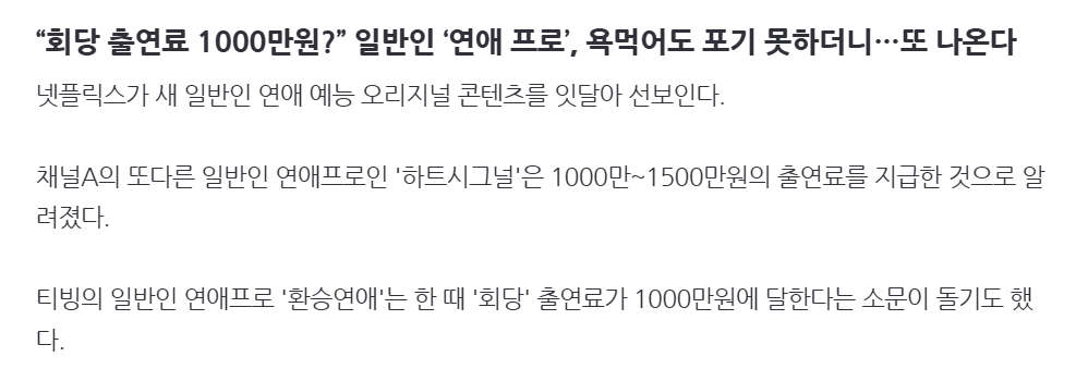 “회당 출연료 1000만원?” 일반인 ‘연애 프로’, 욕먹어도 포기 못하더니…또 나온다