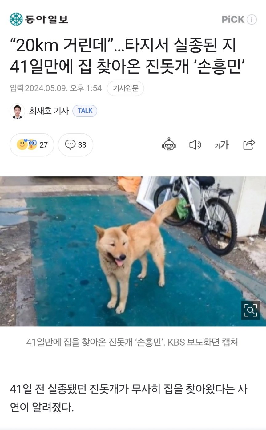 타지서 실종된 지 41일만에 집 찾아온 진돗개 ‘손흥민