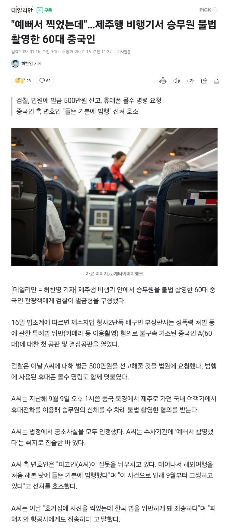 "예뻐서 찍었는데"…제주행 비행기서 승무원 불법 촬영한 60대 중국인