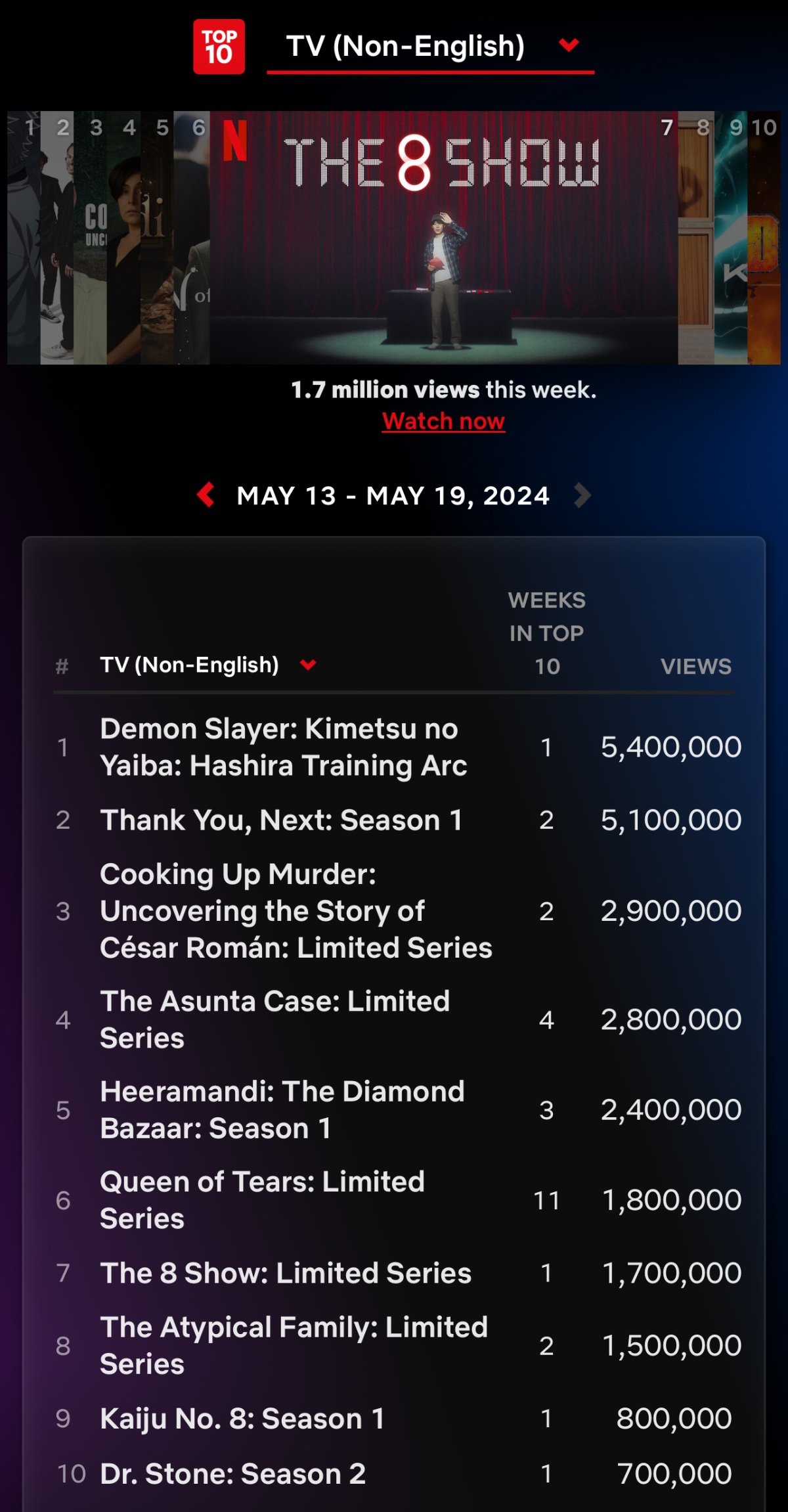 지난 1년간 공개된 넷플릭스 한드 오리지널 17개 중 더에이트쇼보다 낮은 작품은 4개 뿐임