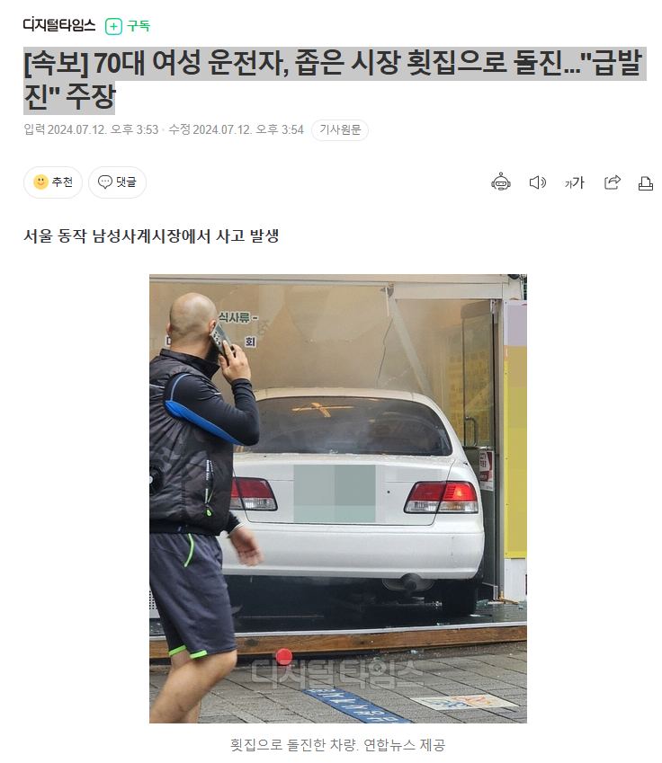 [속보] 70대 여성 운전자, 좁은 시장 횟집으로 돌진..."급발진" 주장