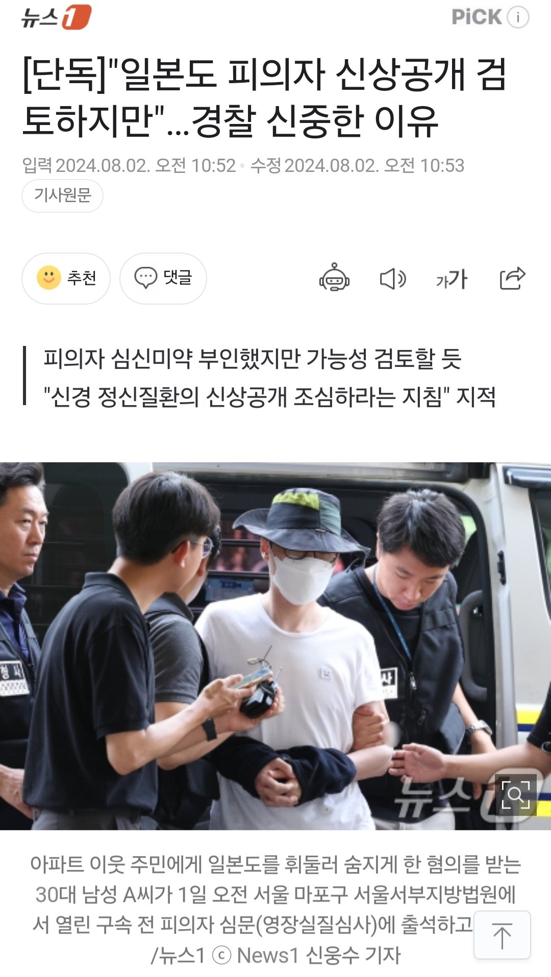 경찰이 '일본도 살인' 사건 피의자 백 모 씨(37)의 신상공개 필요성을 검토하고 있다. 다만 백 씨가 신경 정신질환자일 가능성을 고려해 신중하게 접근한다는 방침이다.2일 <뉴스1> 취재를 종합하면 서울경찰청은 백 씨의 신상공개에 관해선 법적 요건에 해당하는지와 조사 내용을 토대로 필요성을 검토하고 있다. 경찰 관계자는 전날 <뉴스1>과의 통화에서 "백 씨의 신병이 확보되면 검토할 방침이지만 실제 신상공개위 개최 가능성엔 확답하기 어렵다"고 했다. 경찰은 1일 백 씨를 구속해 신병을 확보했다.