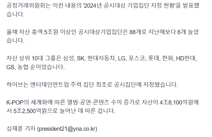 'BTS·뉴진스' 하이브, 엔터사 최초 대기업집단 지정