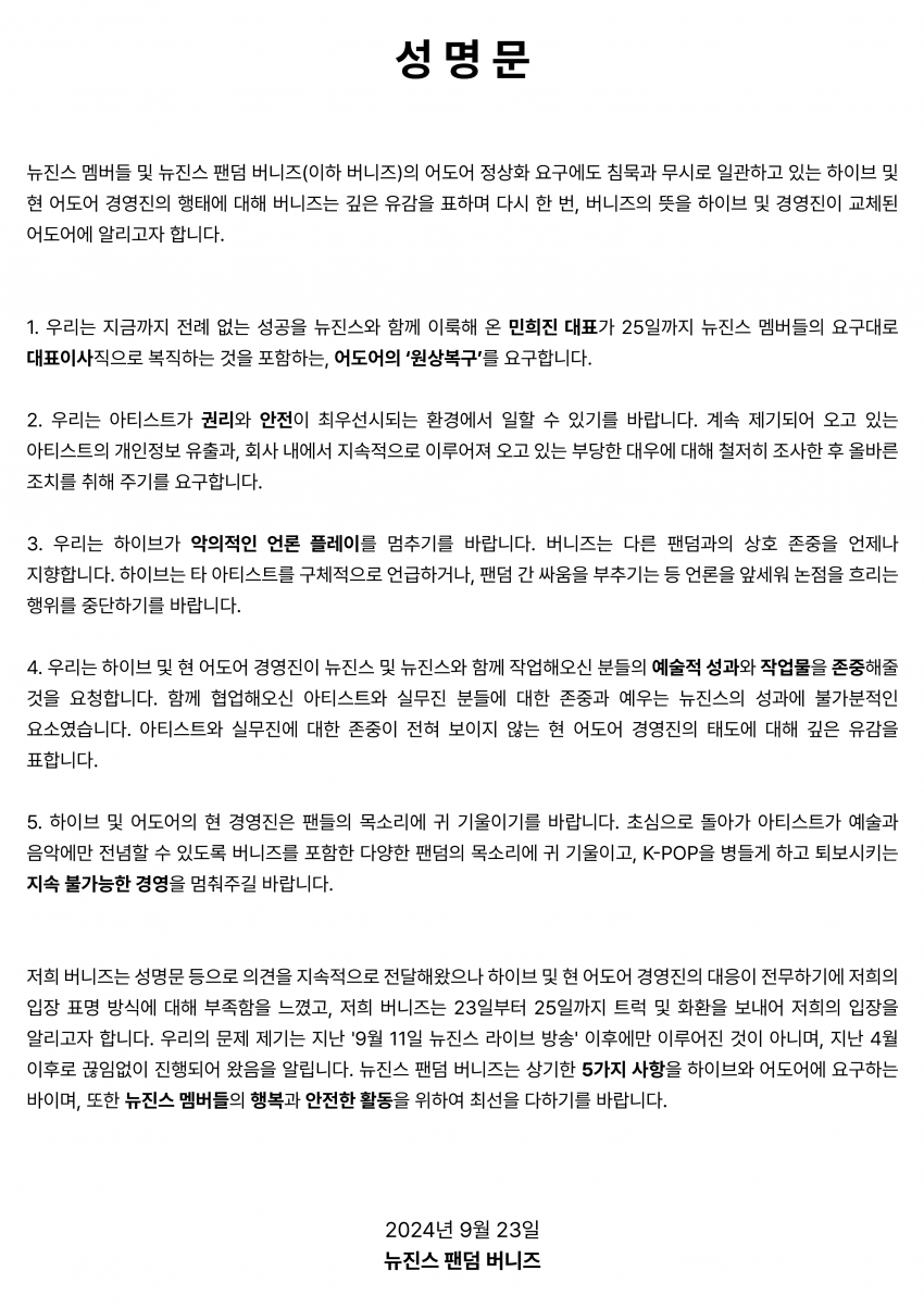 뉴진스 팬덤 버니즈 성명문 발표.jpg