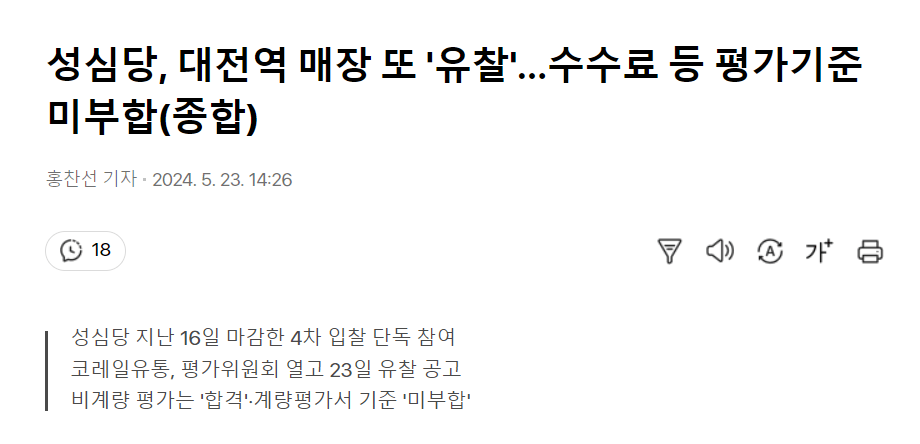 3) 오늘까지 월 수수료는 3억5300만원 수준으로 4차 입찰이 진행되었고 성심당이 단독 참여했지만 유찰되었음