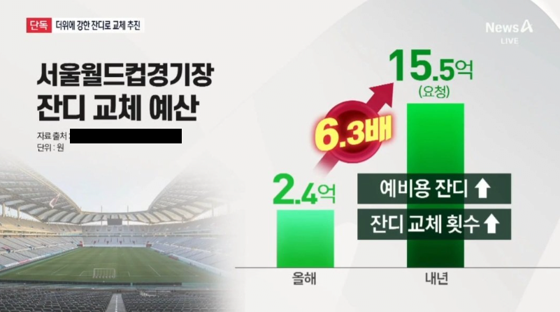 최근들어서는 올해 30억원을 잔디 보존에 사용하기로 했다고 함(30억 이면 국가 대표경기 + FC서울 임대료 다 합쳐도 더 많은 예산임)