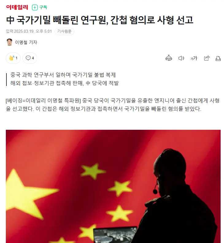 국가기밀 빼돌린 연구원, 간첩혐의로 사형선고