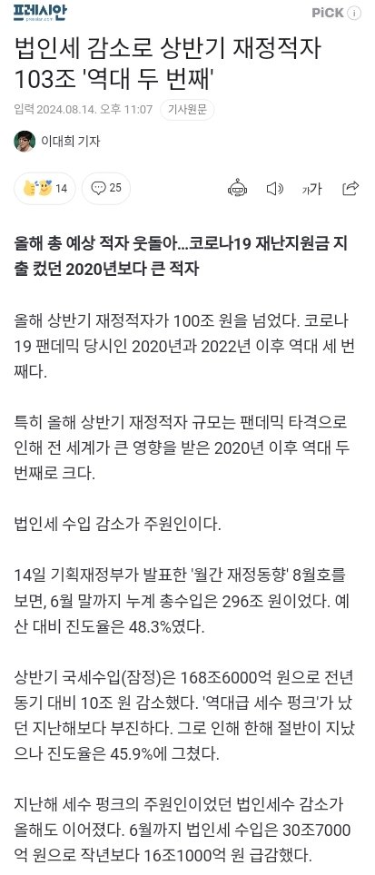 법인세 감소로 상반기 재정적자 103조 '역대 두 번째'