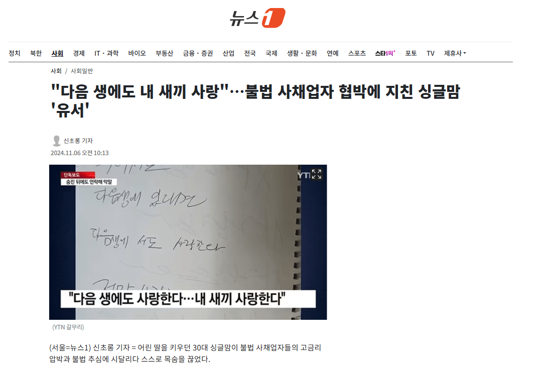 "다음 생에도 내 새끼 사랑"…불법 사채업자 협박에 지친 싱글맘 '유서'