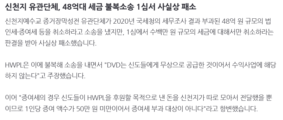 신천지 유관단체, 48억대 세금 불복소송 1심서 사실상 패소
