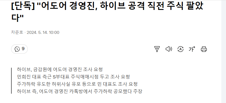 오늘의 하이브-어도어 기사 요약