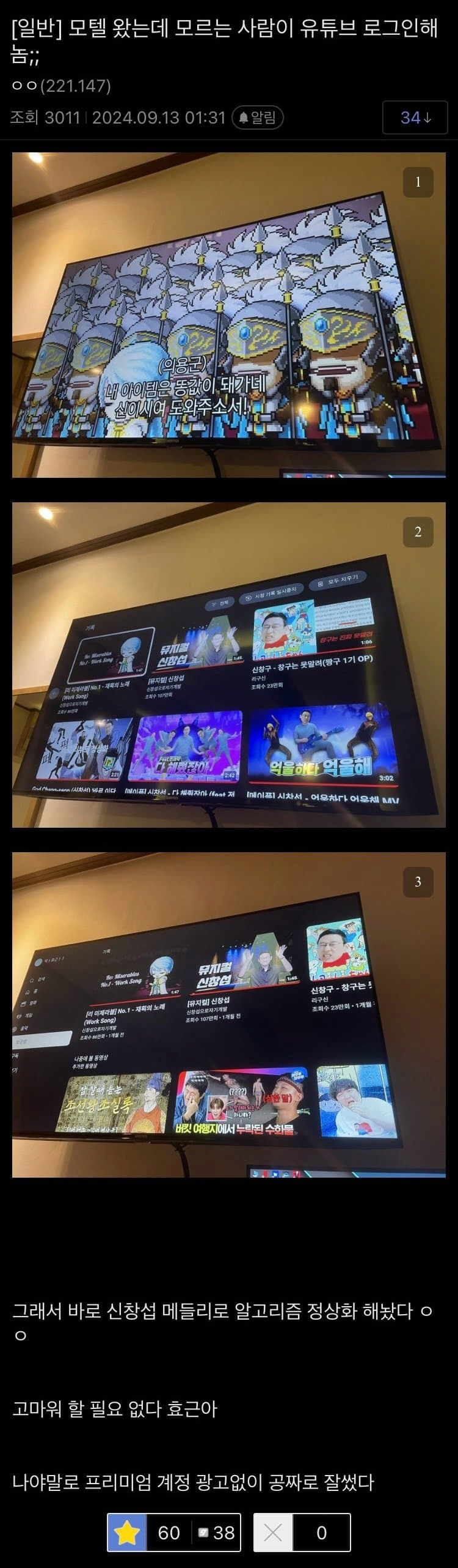 모텔에서 유튜브 로그아웃 안하고 나간 사람 알고리즘 정상화 해준 디시인