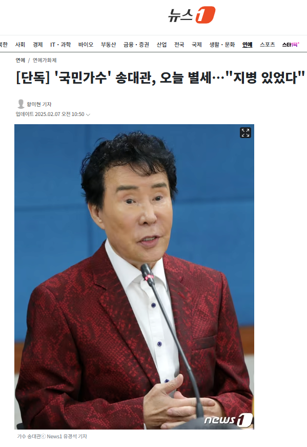 7일 뉴스1 취재에 따르면, 송대관은 이날 세상을 떠났다. 빈소는 서울대학병원 장례식장에 마련될 예정이다.