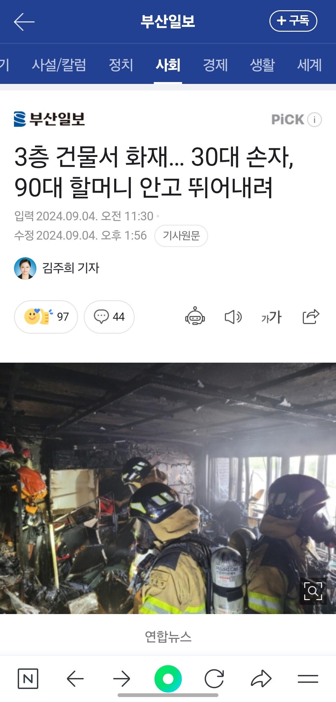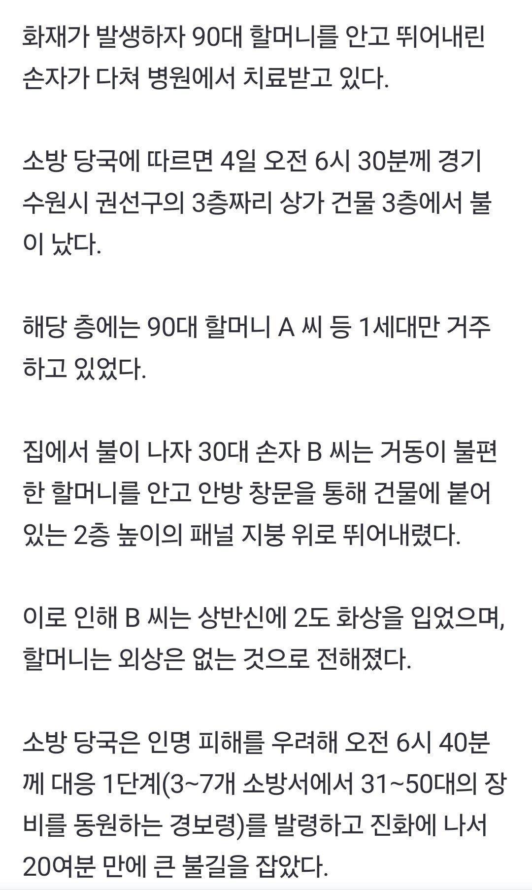 30대 손자, 집에 불이나자 90대 할머니 안고 3층에서 뛰어내려