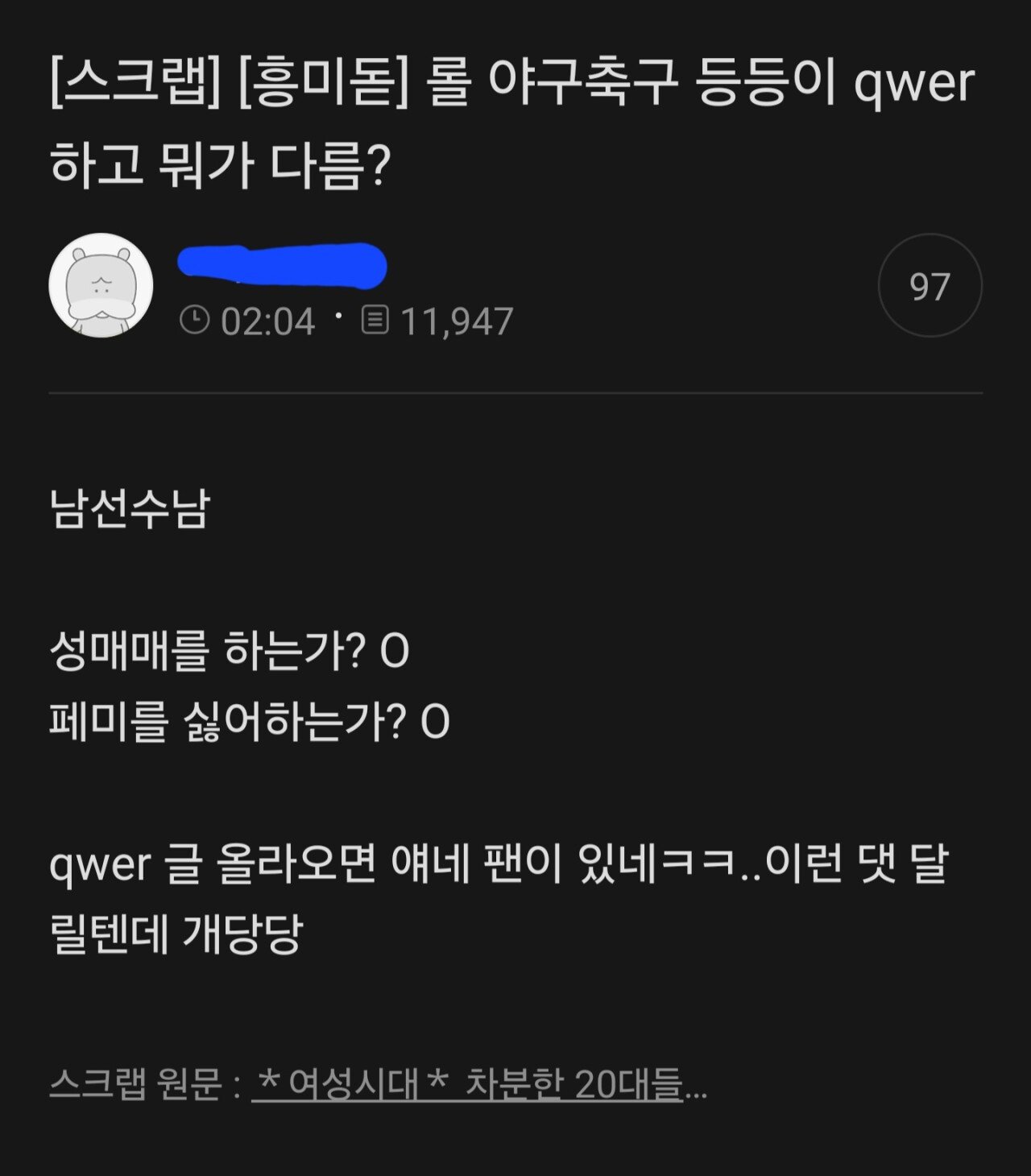 근데 한다는 소리가 성매매하는 한남선수들보다 qwer이 낫다 ㅇㅈㄹㅋㅋㅋㅋㅋㅋ