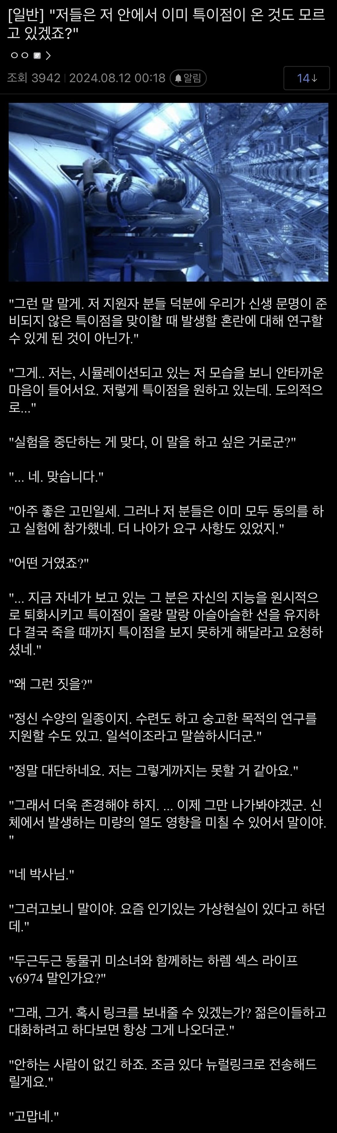 ??? : "저들은 저 안에서 이미 특이점이 온 것도 모르고 있겠죠?"