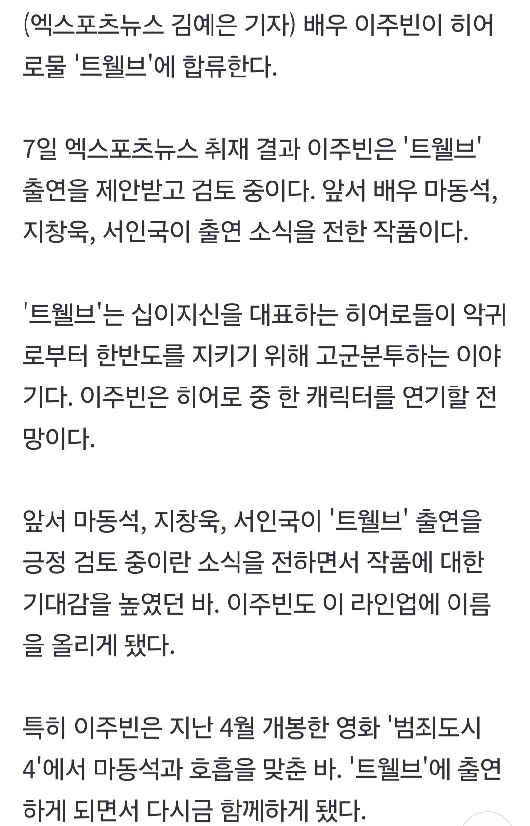 [단독] 이주빈, 또 마동석 만난다…히어로물 '트웰브' 합류