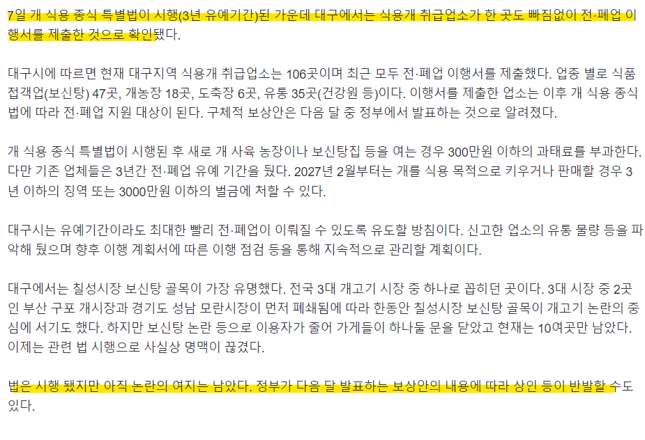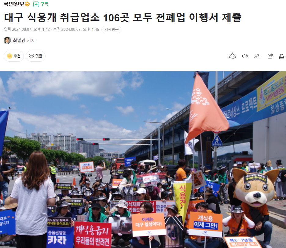대구 식용개 취급업소 106곳 모두 전폐업 이행서 제출