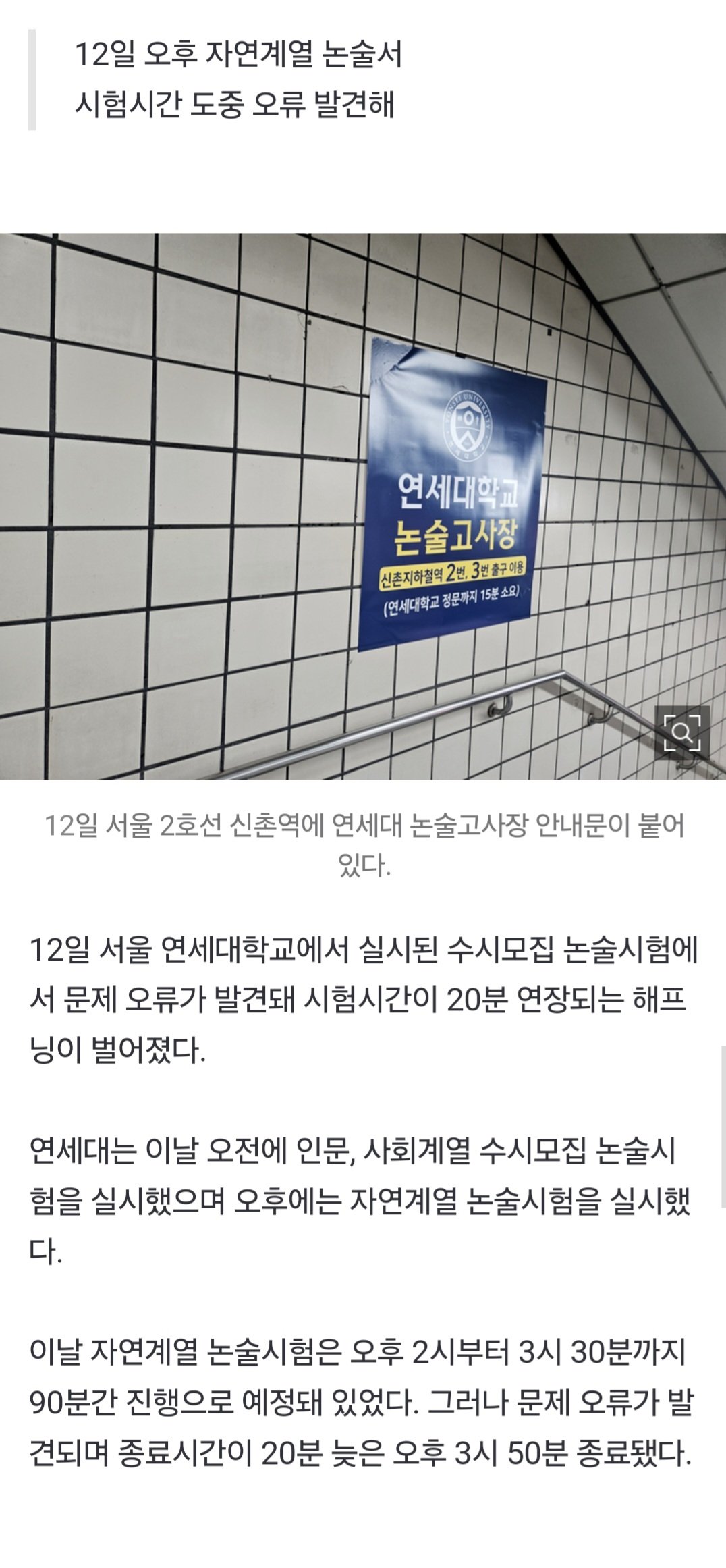 [단독] 연세대 논술시험서 출제오류…시험시간 20분 연장