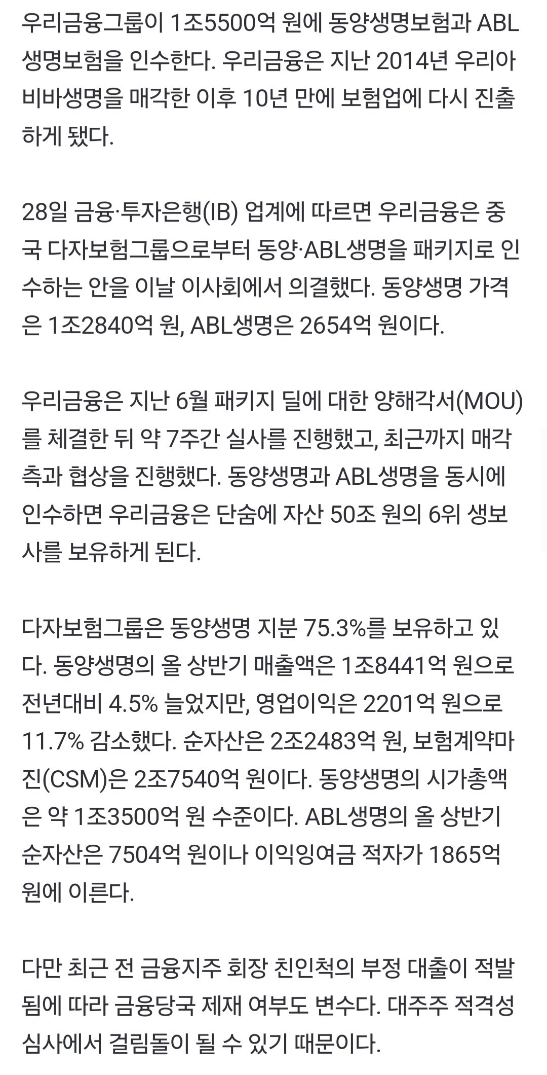 [단독] 우리금융 1.55조에 동양·ABL생명 인수 [시그널]