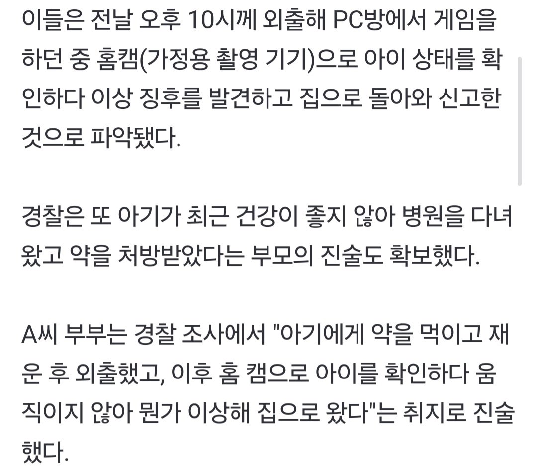 23개월 아기 숨진 채 발견…부모가 PC방서 게임하다 홈캠으로 확인후 신고