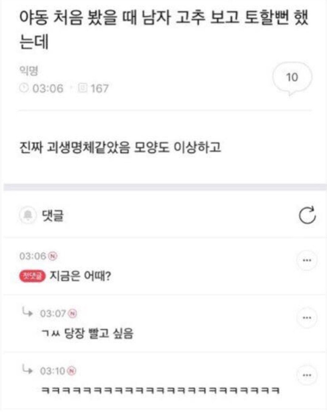 야동에서 남자 xx 처음 봤을때 토할뻔했는데
