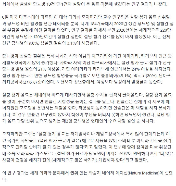 콜라 많이 먹는 콜롬비아는 당뇨병 발병률이 약48% 라고함 ㄷㄷ