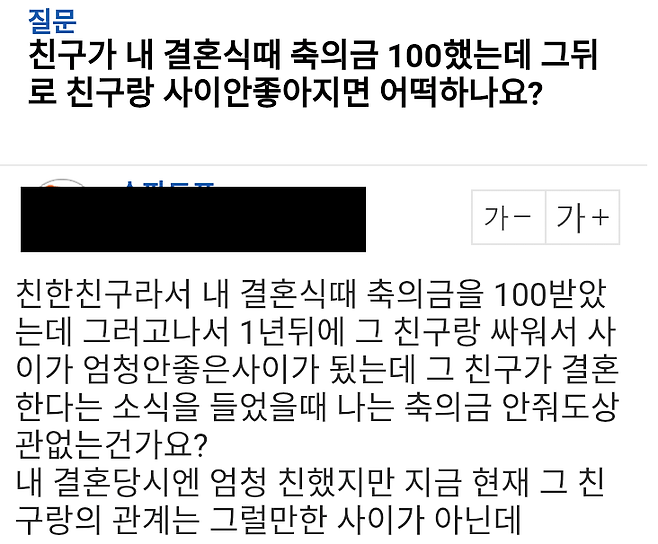 축의금 100만원 한 친구와 싸운 사람