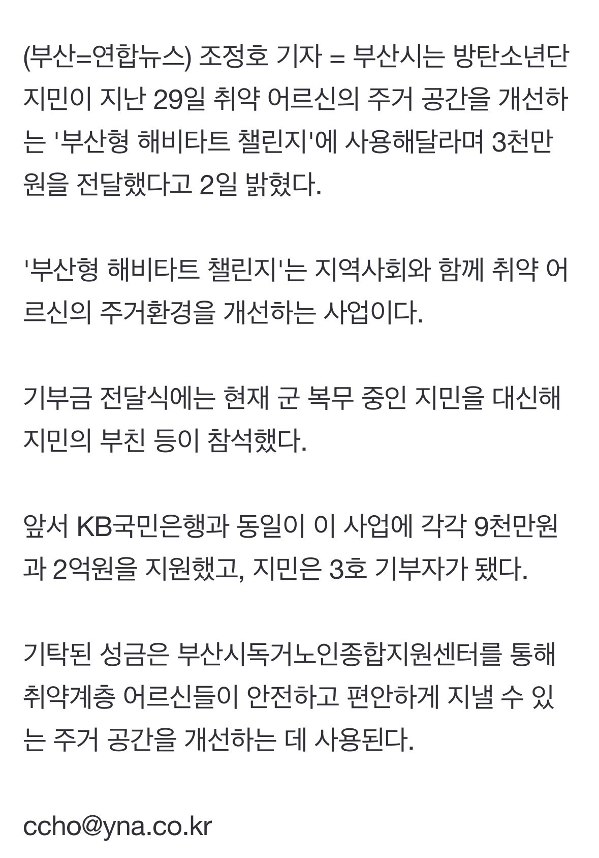 방탄소년단 지민, 부산 취약계층 주거 개선 3천만원 기부