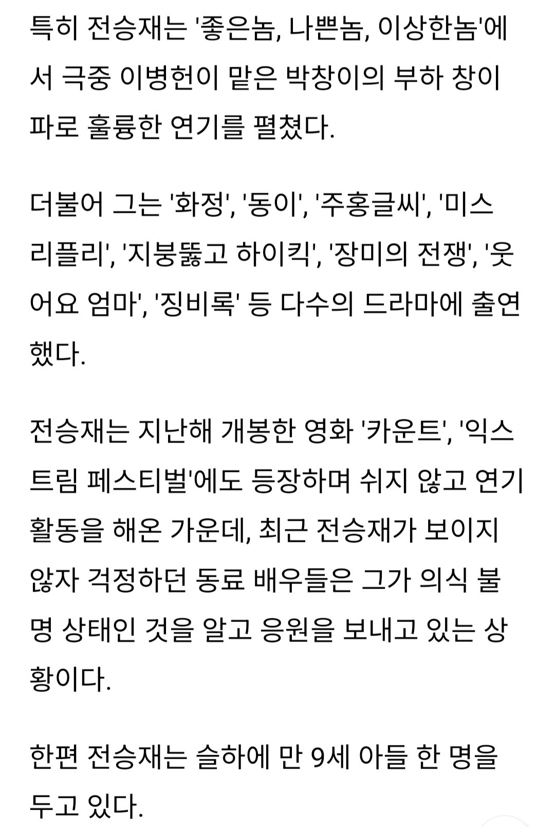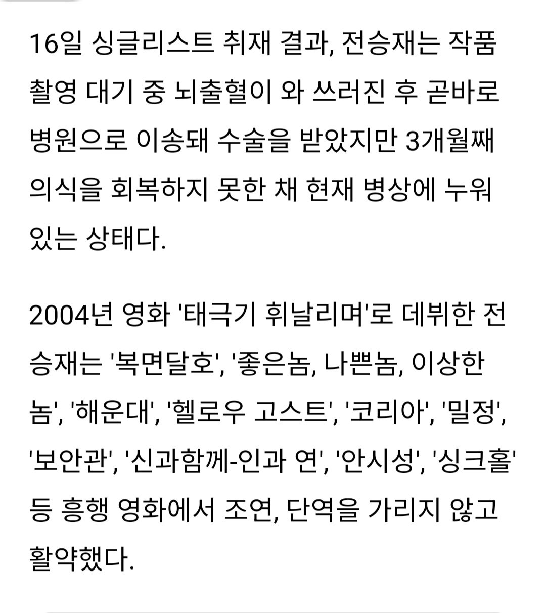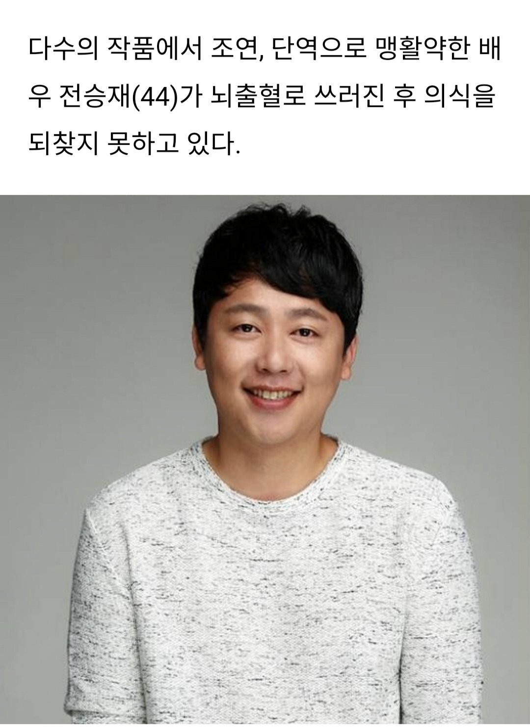 [단독]배우 전승재, 촬영 대기중 뇌출혈로 쓰러져 3개월째 의식불명