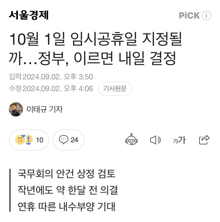 만약 현실화하면 월요일인 9월 30일 휴가를 내는 사람은 9월 28일 토요일부터 10월 1일 화요일까지 4일간의 연휴를 누릴 수 있다. 2일과 4일까지 추가로 휴가를 낸다면 총 9일을 쉴 수 있다.