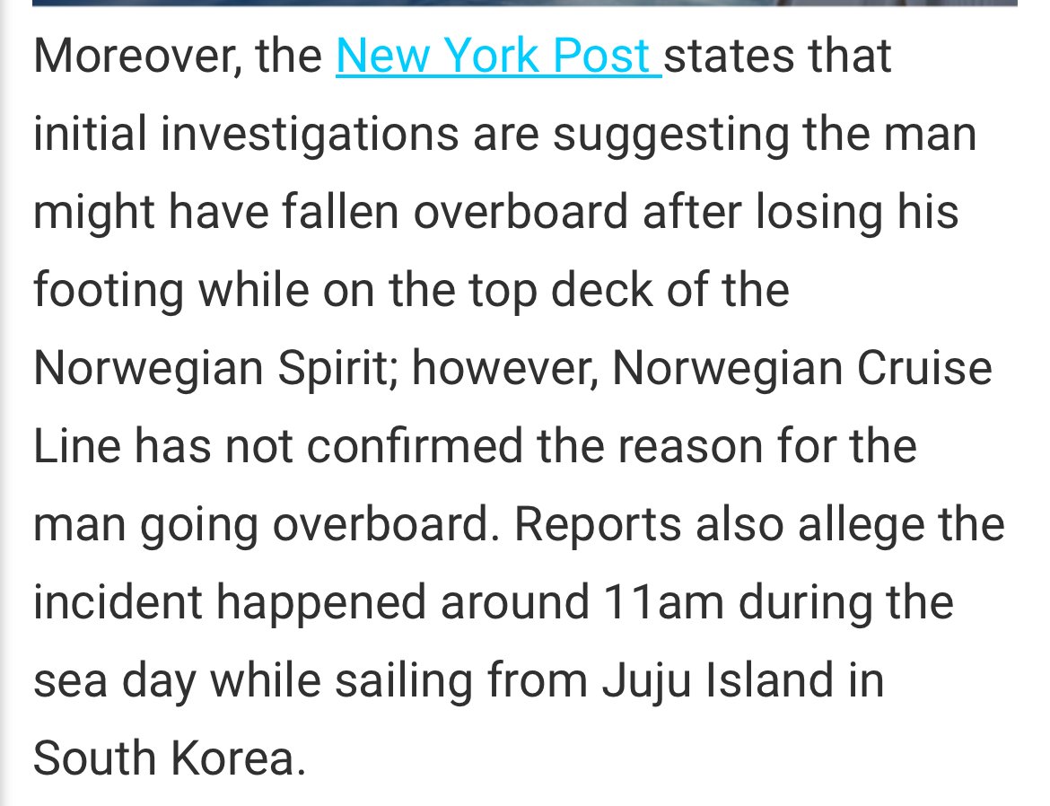 기사 좀 찾아보니까 초기조사 결과로는 남자가 꼭대기 쪽에서 발을 헛디뎠다는 이야기가 있네. 선 측에선 아직 컨펌은 아직 하지 않은 상태. 그리고 오전 11시쯤 제주 앞바다에서 대만으로 돌아가는 길에 난 사고라고 함.