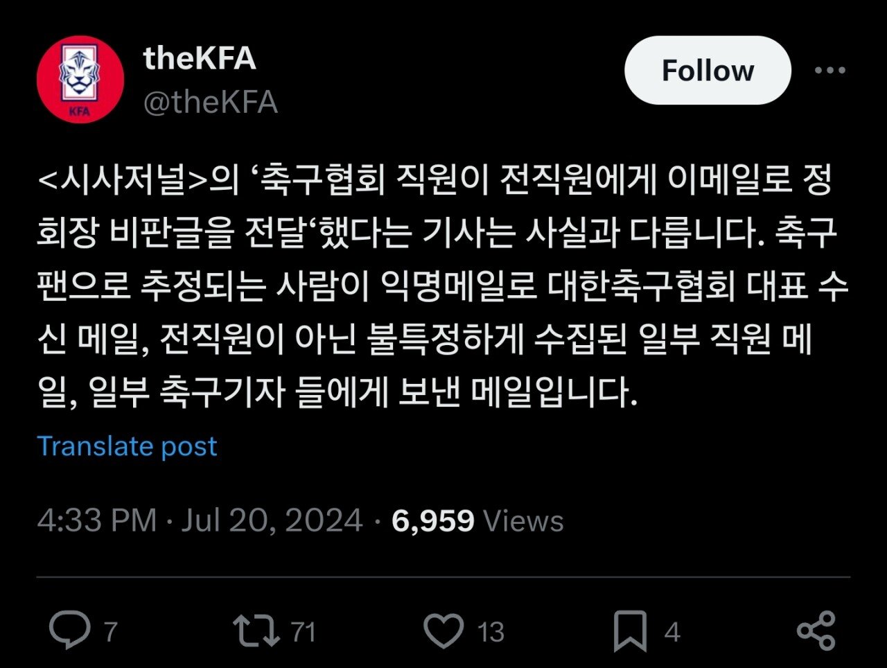 [공식] 대한축구협회 "축구협회 이메일 사건은 허위 사실"