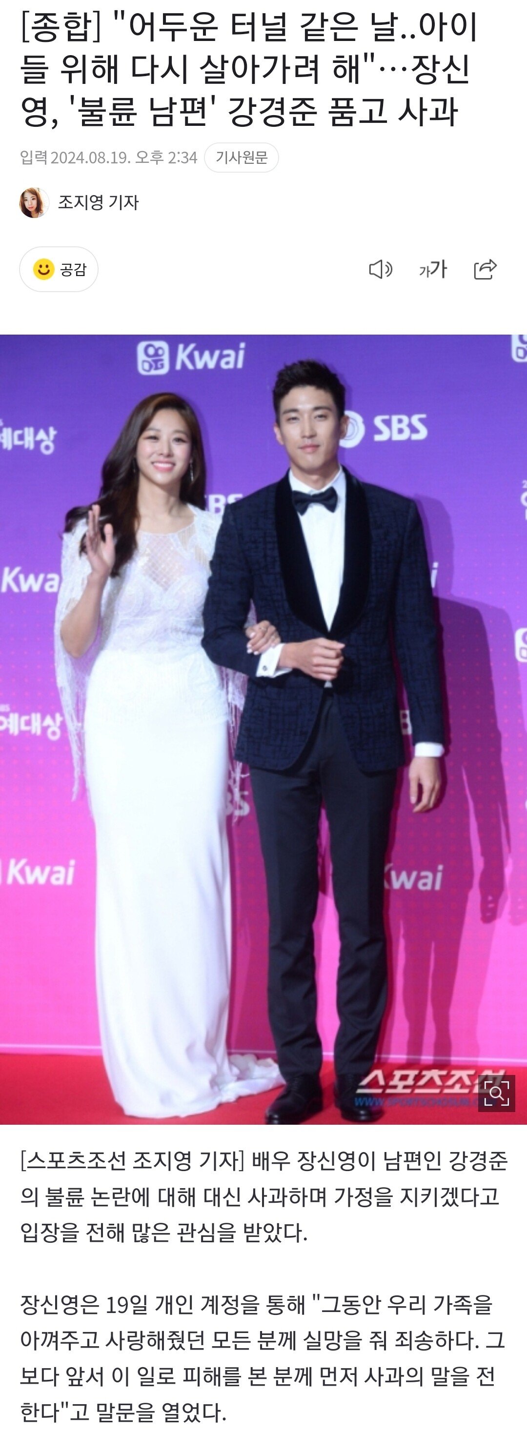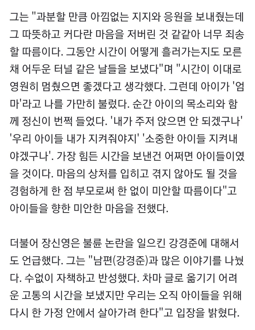 [종합] "어두운 터널 같은 날..아이들 위해 다시 살아가려 해"…장신영, '불륜 남편' 강경준 품고 사과