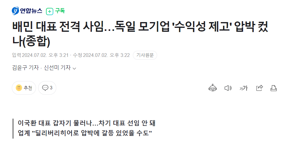 한 업계 관계자는 "수익성을 제고하라는 독일 모회사 DH의 압박이 심했다고 들었다. 배민(우아한형제들)이 전에는 중장기 성장을 보고 투자했을 테지만 지금은 대주주인 DH 입장에선 돈 버는 곳이 배민밖에 없기 때문"이라고 지적했다.