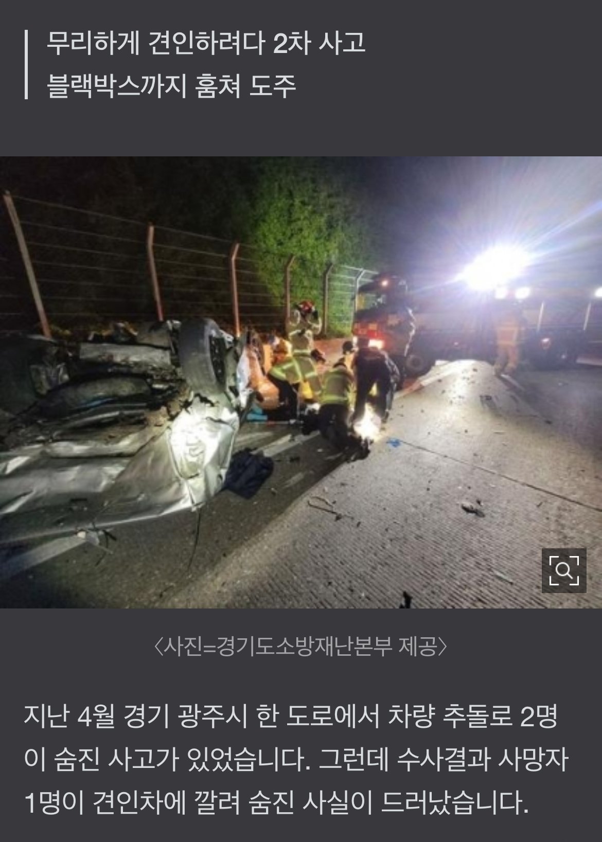 견인차 운전자는 "승용차 운전자가 이미 숨진 줄 알고 2차 사고로 덤터기를 쓰게 될까봐 블랙박스 메모리를 챙겨 떠났다"고 경찰에 진술했습니다.