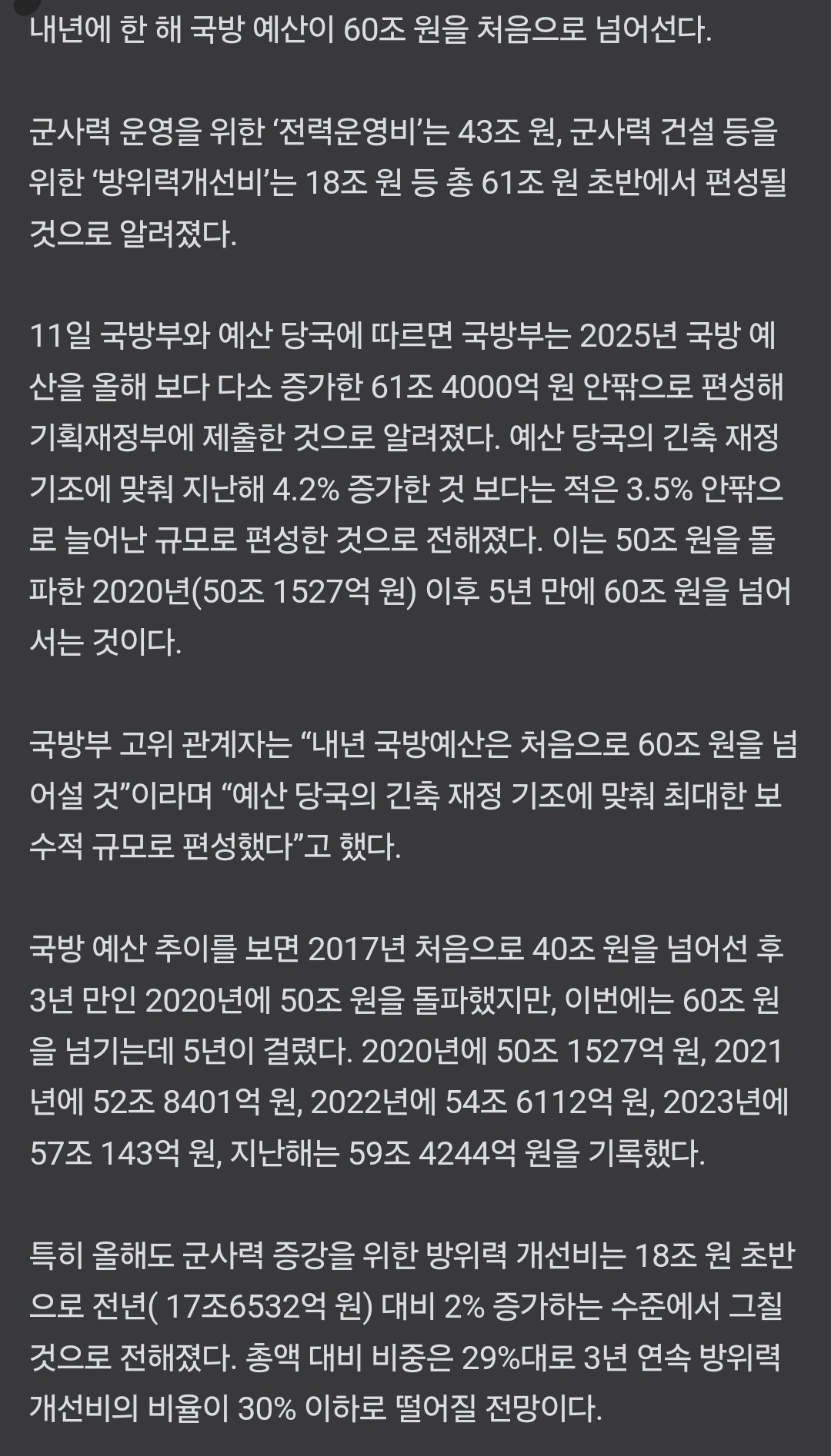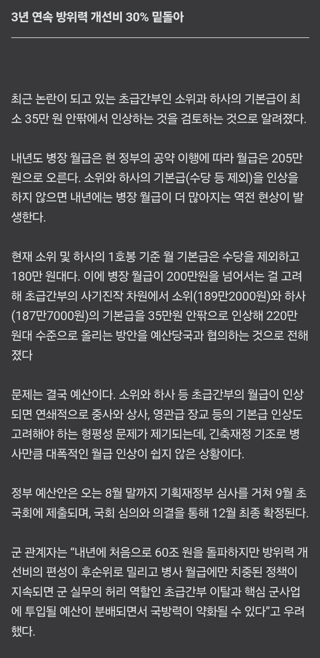 내년 국방예산 60조 첫 돌파, 소위 하사 기본급 35만원 내외인상