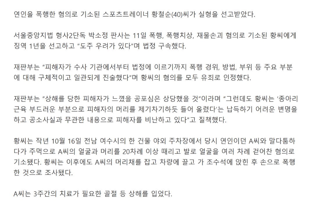 황철순이 얼굴과 머리를 20차례 이상 때렸는데 전치 3주