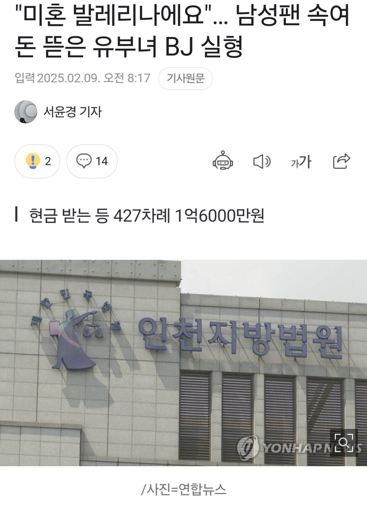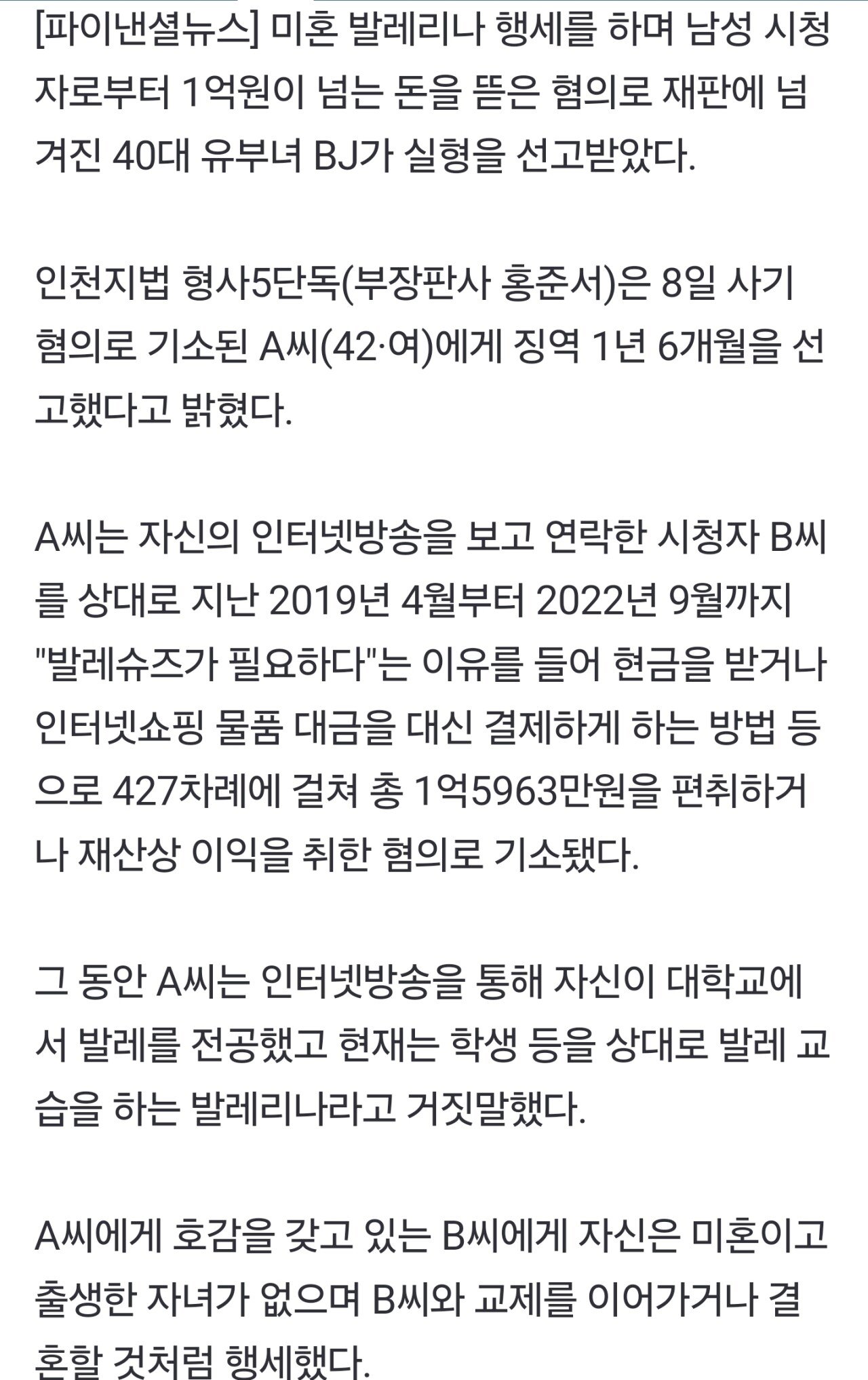 "미혼 발레리나에요"… 남성팬 속여 돈 뜯은 유부녀 BJ 실형