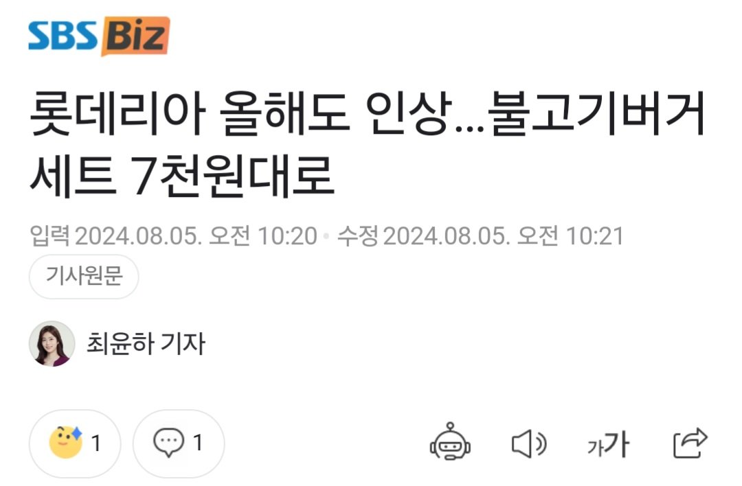 롯데리아 버거류 가격 2.2% 인상 불고기버거세트 7000원대 돌입