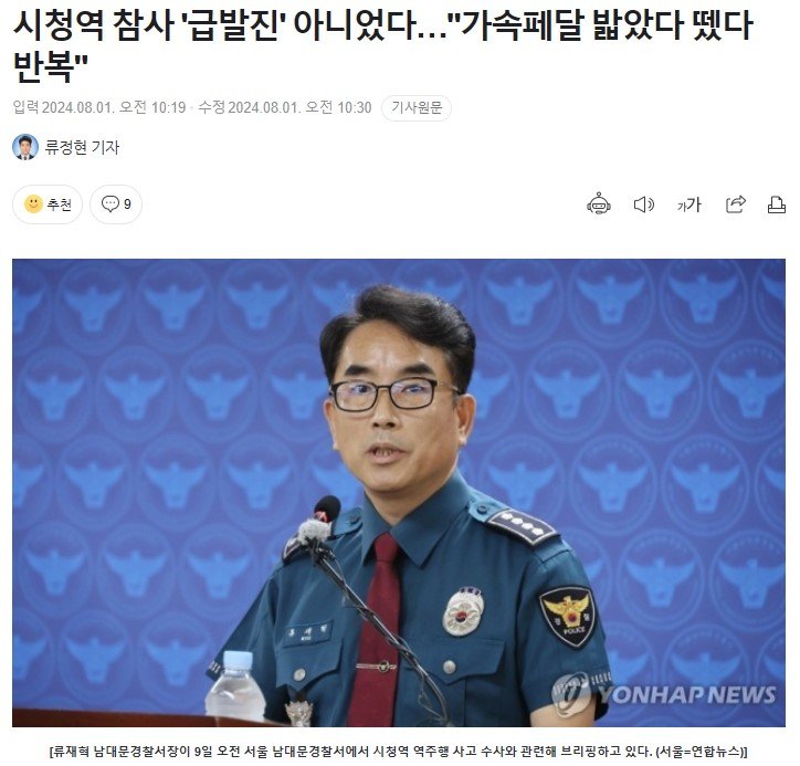 류 서장은 "피의자는 주차장 출구 약 7∼8m 전에 이르러 '우두두'하는 소리와 함께 '브레이크가 딱딱해져 밟히지 않았다'며 차량 결함으로 인한 사고라는 주장을 일관되게 유지하고 있다"고 설명했습니다.
