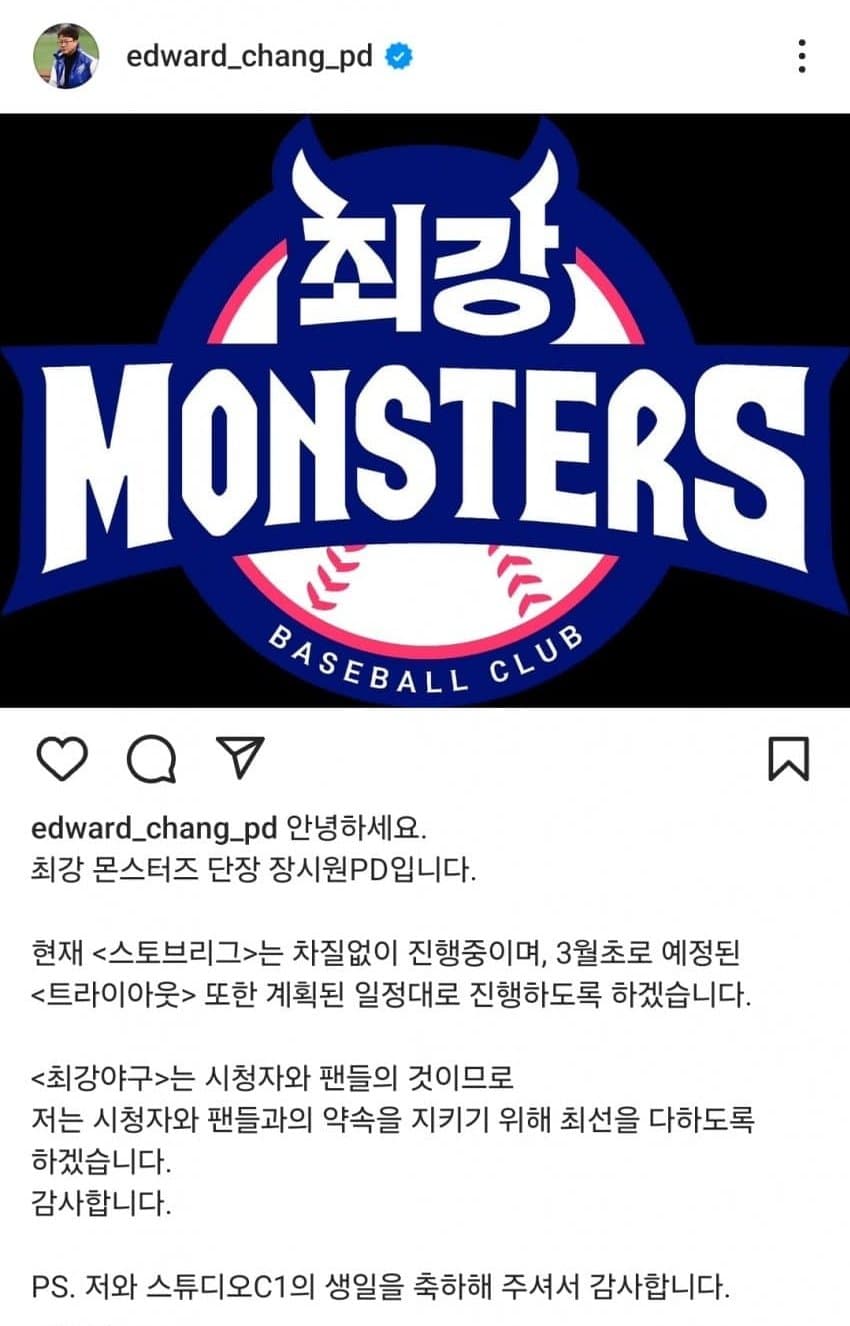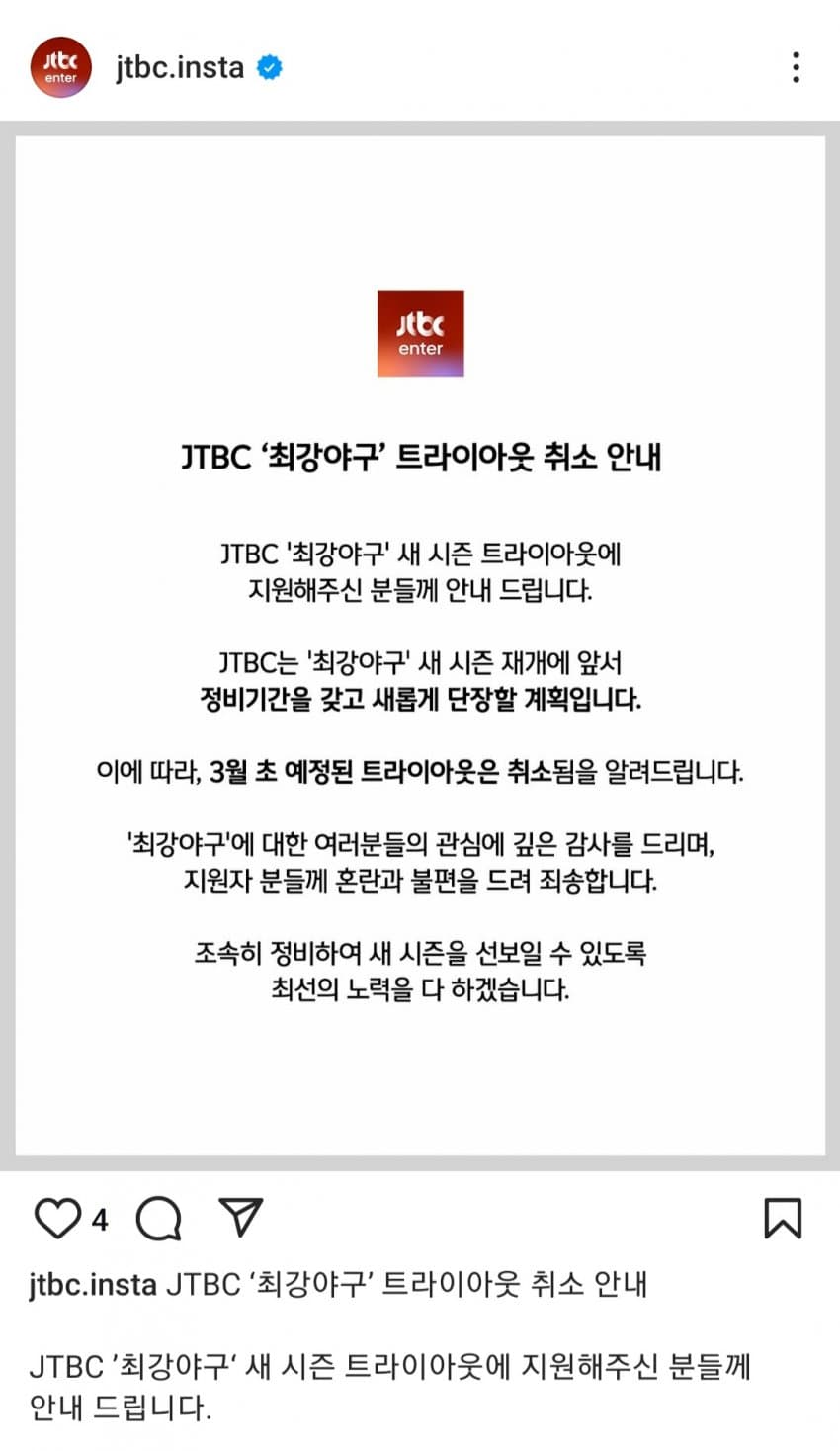 JTBC에서 최강야구 트라이아웃이 취소 됐다고 인스타 공지가 올라왔는데