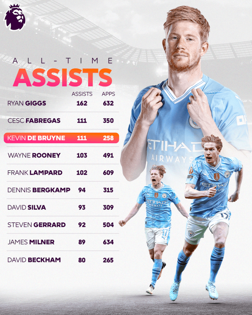 케빈 더 브라이너, 프리미어리그 역대 어시스트 공동 2위 달성