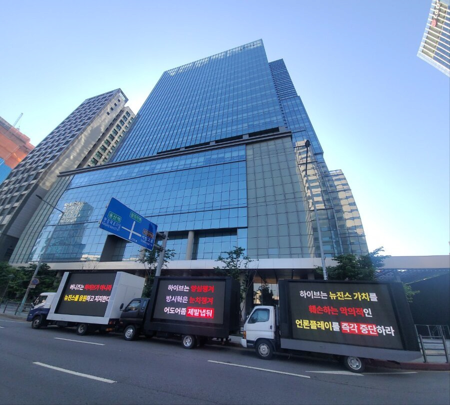 방탄 팬들은 근조화환보내고 뉴진스 팬들은 트럭보내고 하이브 난리네요
