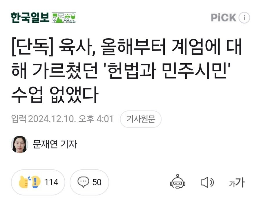 육사, 올해부터 계엄에 대해 가르쳤던 '헌법과 민주시민' 수업 없앴다